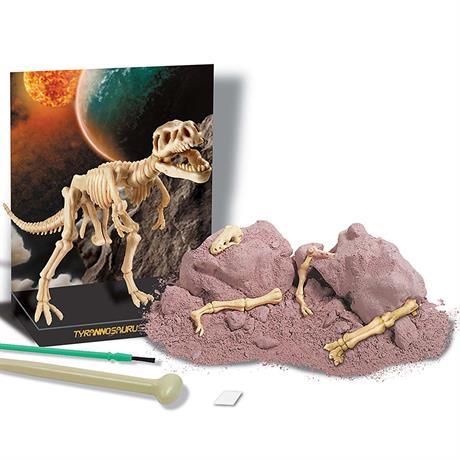 Вкрийте робоче місце плівкою або газетами та підготуйте фартух або старий одяг: буде багато пилу. Що необхідно кожному мисливцю за старовиною? Правильно! Лопатка та молоток. У наборі для досліджень ви знайдете все необхідне для розкопок. Коли з гіпсового блоку покажуться перші знахідки, використовуйте інструменти з обережністю. Очистіть кістки від пилу за допомогою пензлика. Протріть його залишки з кісток сухою ганчіркою та зберіть скелет тиранозавра за схемою. Додайте в місця кріплення суглобів трохи м'якого воску для фіксації. Настав час ближче познайомитися з «королем» динозаврів – Ті-Рексом.