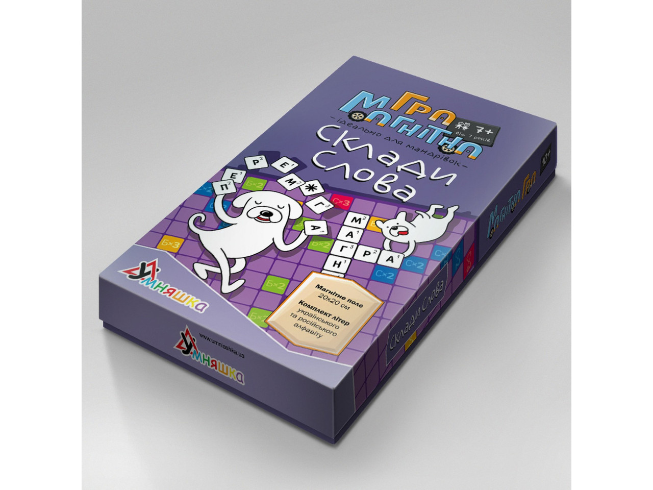 Склад: магнітне поле 20х20см, комплект магнітних букв українського алфавіту.
