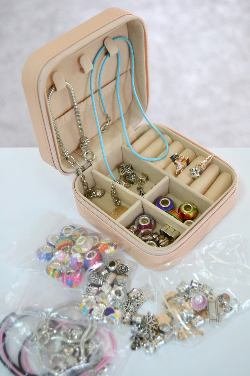 Комплектація: 3 металевих основи для браслету (довжина 15 см); 3 основи для підвісок на шию (довжина - 43 см); 20 підвісок; 20 кольорових намистин; 20 шармиків різної форми, подарунковий пакетик.