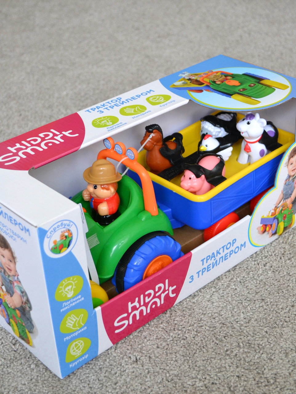 Ігровий набір Трактор з трейлером Kiddi Smart, озвучений українською мовою, - це яскрава музична іграшка, яка розважить малюка сяючими вогниками, приємною музикою та веселими звуками.